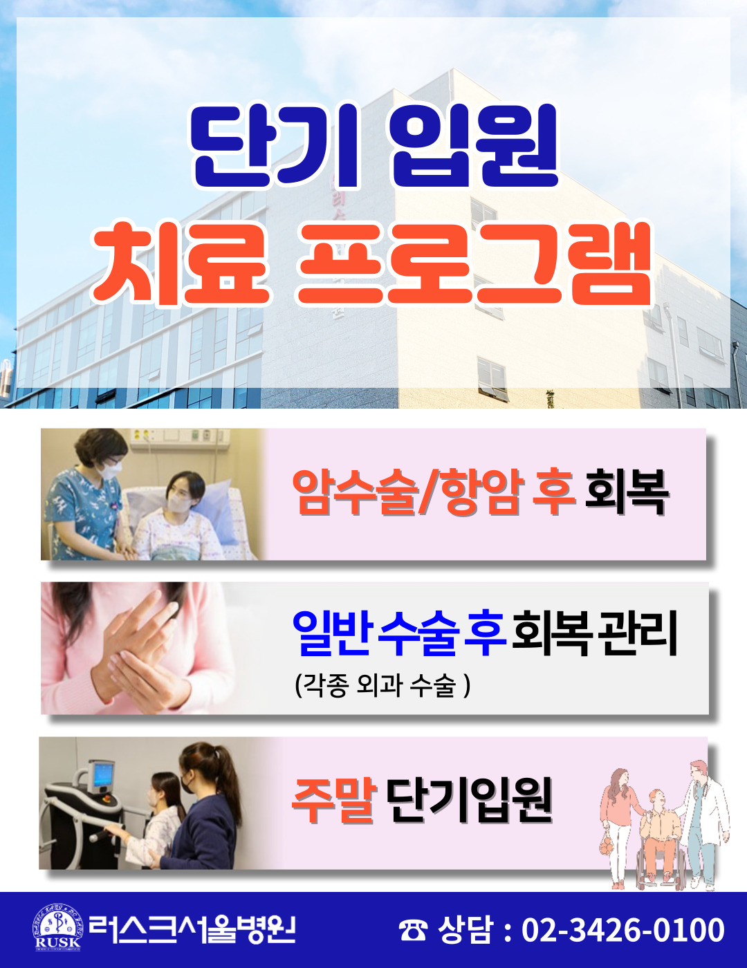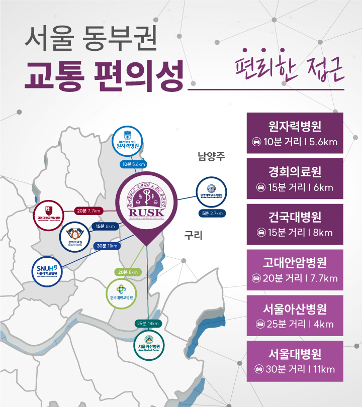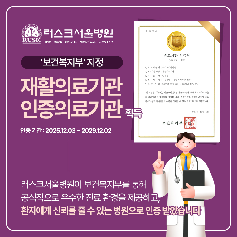 수술 후 상처 회복을 통해 후유증이나 부작용을 예방하고, 빠른 건강 회복을 위한 재활치료를 시행합니다.